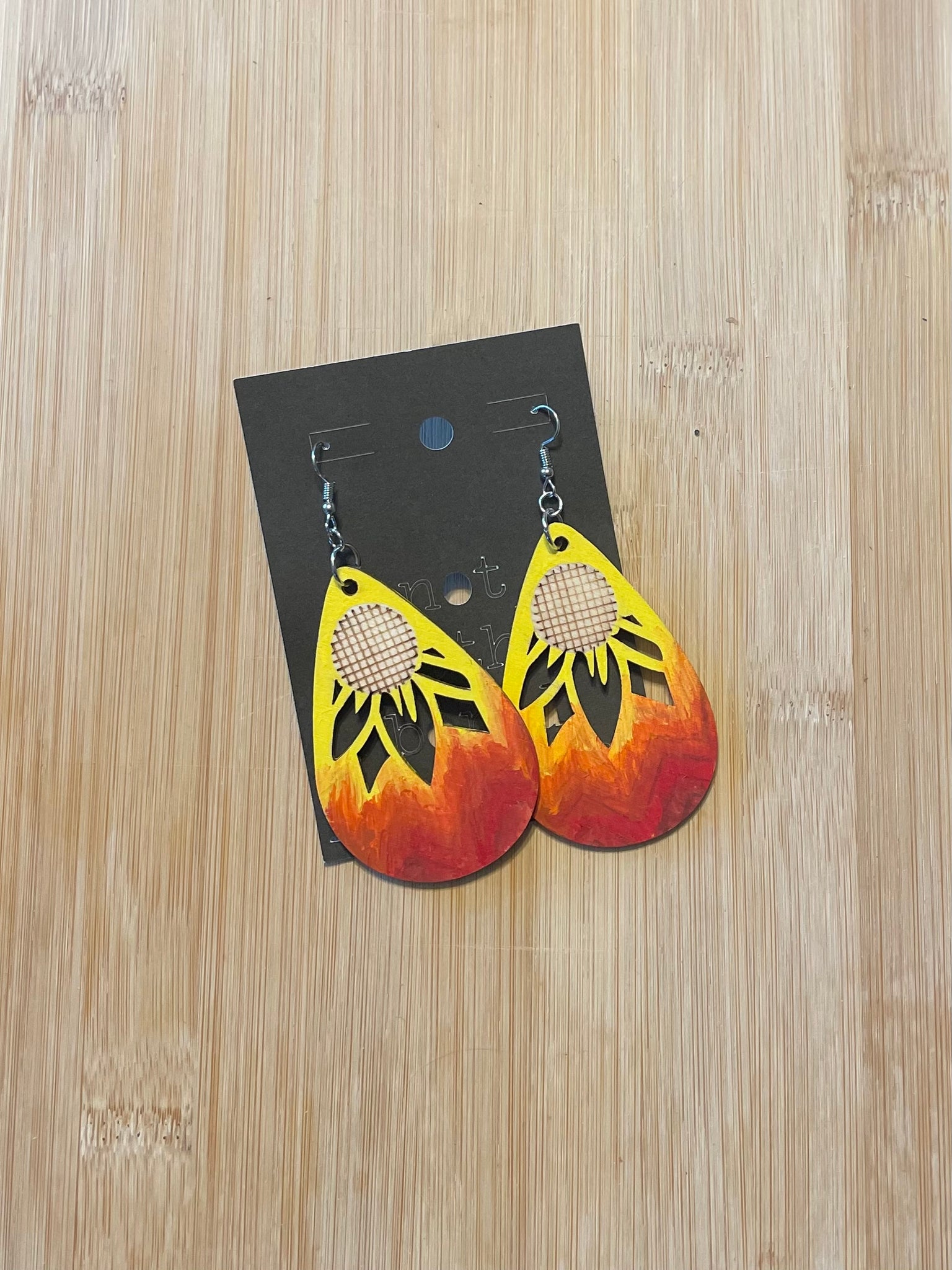 Wooden Cutout Earrings: Teardrop Burnt/Hand Painted Fire Sunflower Design